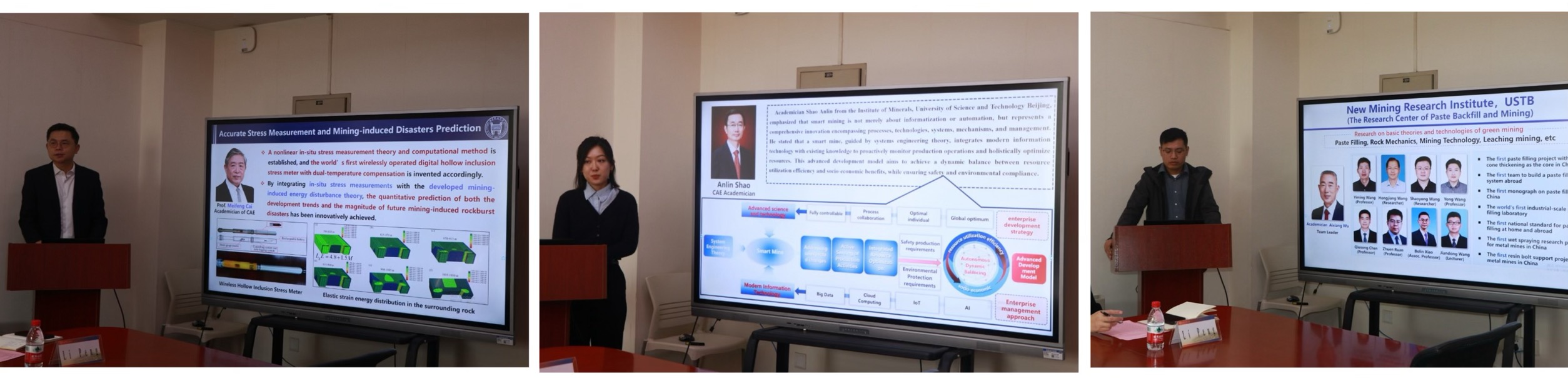 蔡美峰院士团队、邵安林院士团队、吴爱祥院士团队的教师代表分别围绕团队科研方向及主要成果作了介绍和交流。