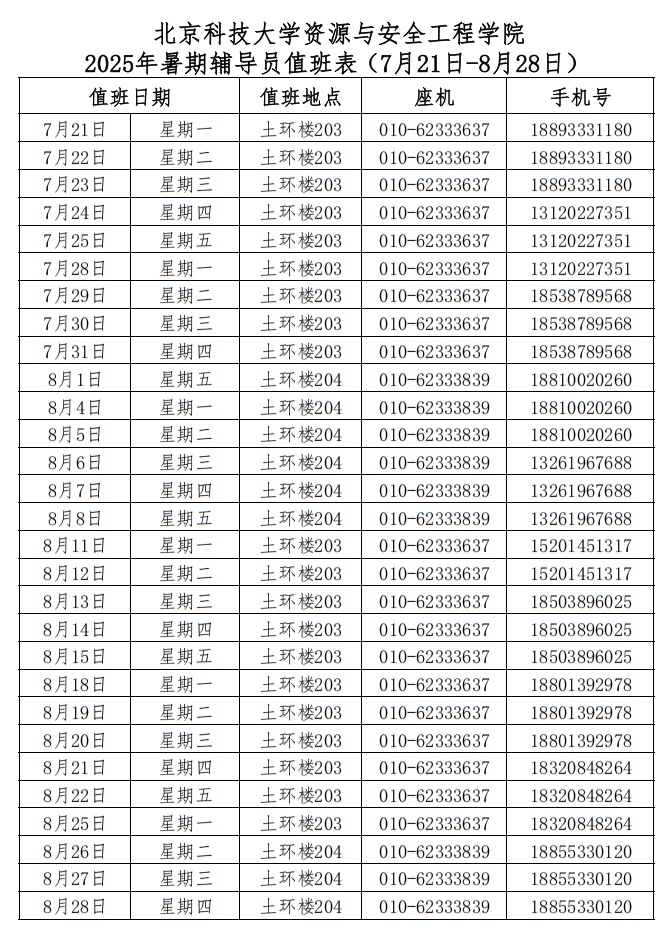 2026世界杯官网2025年暑期辅导员值班表(7月21日-8月28日)