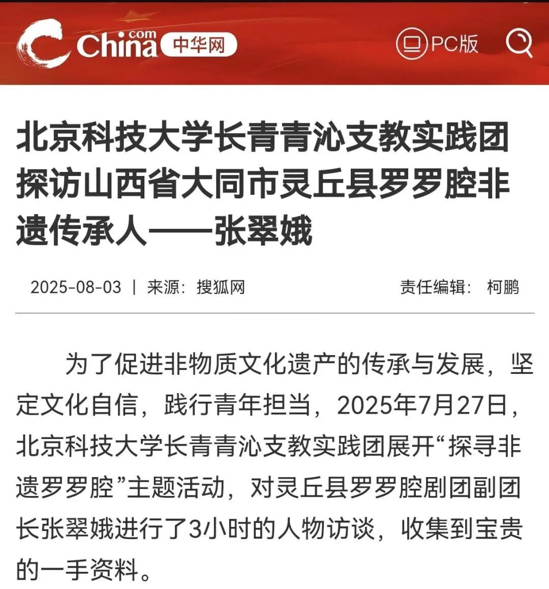 针对实践地情况,团队成员为当地省级重点文物保护单位构建“3D模型”,将珍贵文物资源数字化保存;采访灵丘罗罗腔、布老虎、堰兴剪纸等非遗文化传承人,学习传承茶艺、蜡染、雕版印刷等文化,提高当地文化软实力。