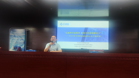 矿冶科技集团有限公司高希宇博士(学院2008级矿物加工工程专业员工)给员工们讲述了“一块石头的故事”,带员工们参观了选矿实验室。员工们认真听着师姐的讲解,热情高涨地围着浮选机观察矿物被泡沫浮选出来的情形。随后,同学们来到利用选矿尾矿和冶金矿渣制备的产品展览区,坚固的墙砖、精美的瓷砖、温润如玉的手镯和挂件,让员工们叹为观止,深切感受到矿业技术的魅力。