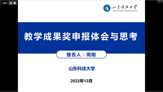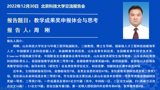2022年12月30日下午,应土木与资源工程学院黄志安教授邀请,山东科技大学安全与环境工程学院副经理周刚教授为全院教师开展了主题为“教学成果奖申报体会与思考”的讲座。土木与资源工程学院教学经理刘洋教授、各系教学主任及青年教师等40余名教师参加。本次讲座通过线上形式开展。