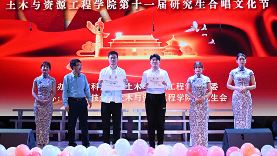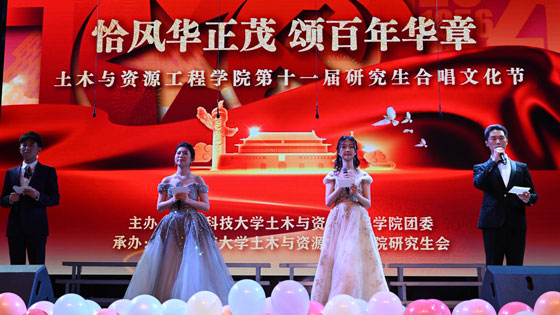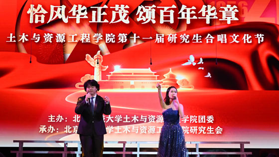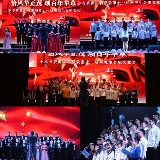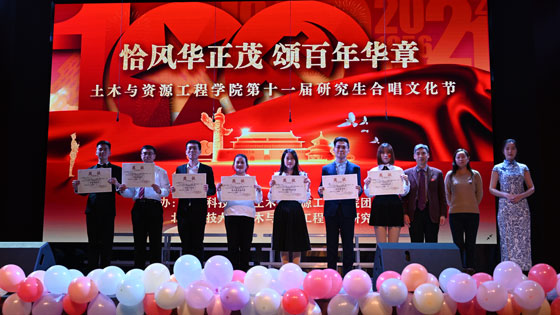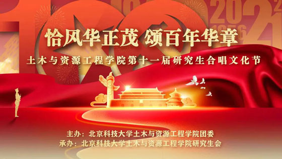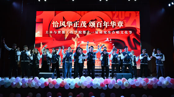 峥嵘百年史,砥砺中国行。为鼓舞新时代青年树立远大理想,勇担时代责任,热爱伟大祖国,争做时代先锋,同时丰富学院研究生课余生活,提高班级集体凝聚力,加强研会与班级之间的联系,促进新生同学与各系所教师之间的交流沟通,经过一个多月的筹备,土木与资源工程学院于2021年12月17日19:00在管庄校区礼堂举办了第十一届研究生合唱文化节。
