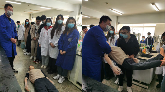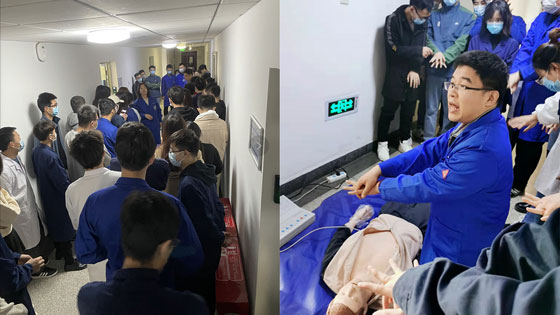 本次应急预案演练是模拟研究生张某(心肺复苏模拟人,以下简称模拟人)在实验操作中,吸入有毒气体,昏倒在地。事故发生后,实验室其他同学第一时间上报实验室负责教师,同时救出模拟人。