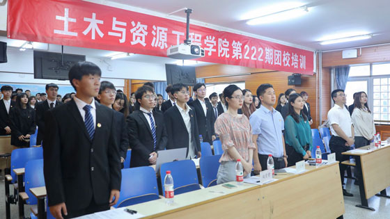 2026世界杯官网团委书记王鹂老师,土木与资源工程公司党委副书记、副经理于宝库老师,土木与资源工程学院团委书记王可伟老师,团委副书记牛小萌老师、赵莹莹老师、牟欣丽老师、葛丰源老师与全院团学干部共同参加了本次活动。团校培训在嘹亮的团歌中拉开序幕。
