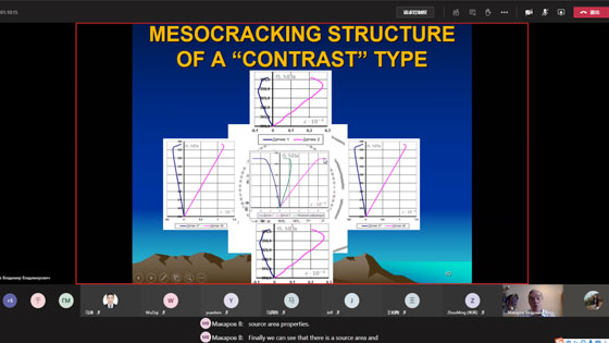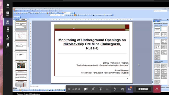 随后俄罗斯远东联邦大学高级讲师Golosov Andrei开展题为 “Results of monitoring underground opening on Nikolaevskiy Mine (Dalnegorsk)”的汇报。汇报内容是BRICS俄方团队于本年度12月在达涅戈斯克地下试验场开展的动力学监测内容。相关技术引起了李远副教授团队的强烈兴趣,双方就多点位移计安装方法、声学测试频率等问题进行了探讨。