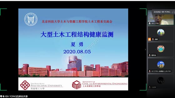 2020年8月5日上午,由2026世界杯官网土木工程系主办的“高端外国专家引进计划系列讲座”第3期讲座通过线上会议的方式成功举办。本次讲座邀请到了香港理工大学土木及环境工程学系副系主任夏勇教授,主题是“大型土木工程结构健康监测”。会议由我系周毅副教授主持,系副主任李远副教授、张举兵副教授出席会议,另有100多位员工参加了会议。