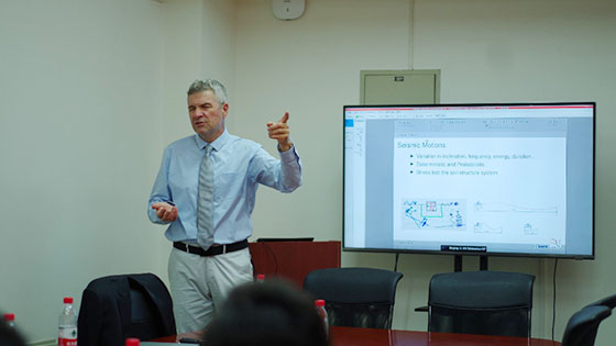 在访问期间,Boris Jeremi?教授对土体结构系统静动力特性的建模与仿真、核电站的土-结构相互作用的计算建模与仿真和地震土结构相互作用的建模与仿真方面等做了精彩的报告。他首先向大家介绍了研究土体结构系统静动力特性的建模与仿真的动机,提出ESSI模拟器系统,并从能量耗散和压力测试试验等学术角度,进一步解释分析土壤或岩石结构的动静态行为的复杂性和必要性;其次从改进地震行为的建模和模拟核装置的角度出发考虑问题,为减少建模的不确定性,同时遵循地震能量的输入和耗散,开辟新的实用建模系统和仿真系统。在教授由浅入深的带领下,大家一步一步地了解了地震、土、结构及其相互作用的知识;最后介绍的是关于地震灾害的预测大都是基于使用计算模型的不确定性下的预测,围绕着建模与仿真的科研主题,对于简化建模,Boris Jeremi?教授认为这种方法有时是合理的,但当比较高级复杂的模型能更好的显示出实际情况及特点时,简化建模就显得并不重要。目前有些计算模型尚未经过验证,教授还指出了建模和参数不确定性的问题始终存在并困扰着学者们的现状。