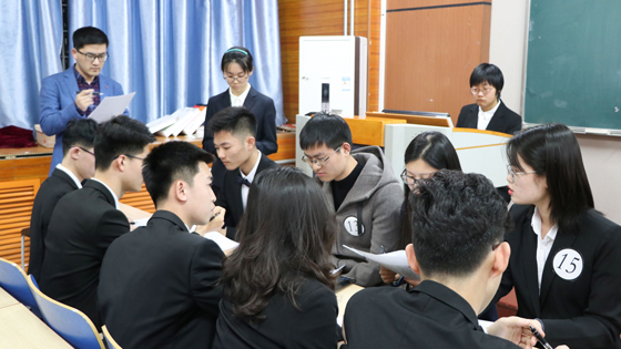 接着进入比赛第一个环节——无领导小组讨论。在本环节,选手们积极阐述各自观点,踊跃发言并与队友讨论辩驳直至获得统一的结论。现场气氛紧张而又有序。本环节结束之后,有八名选手晋级到下一环节。