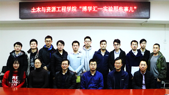 11月28日下午,土木与资源工程学院“博学汇-实验那些事儿”博士生沙龙在土木楼214会议室成功举办,本次活动邀请到学院副经理、实验中心主任宋卫东教授、实验中心书记张延凯老师、副主任张磊老师、资源实验室主任孙金海老师、安全实验室主任欧盛南老师、矿加实验室主任徐承焱老师、土木建能实验室主任黄正均老师,以及各年级博士生参加,活动由学院研工组组长姜琳婧老师主持。