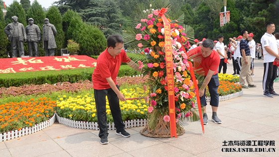 参观结束后,在西柏坡纪念馆前,全体党员老师首先奏唱了中国人民共和国国歌,随后面对党旗,举起右拳跟随李长洪副经理一起重温了入党誓词,誓词虽短,但饱含承诺与担当。随后全体党员老师向“赶考”伟人铜像敬献了花篮和三鞠躬,矿物加工工程系党支部书记李正要老师和安全工程系党支部书记黄国忠老师亲手整理花篮。