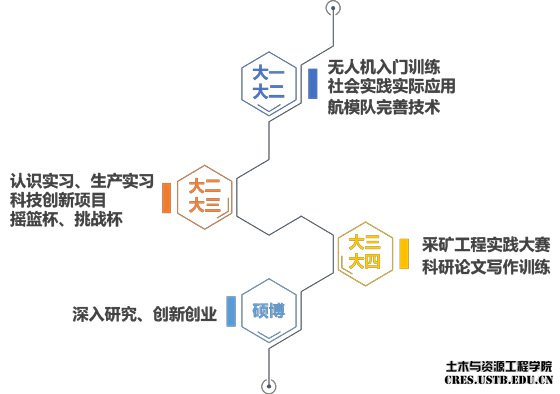 无人机采矿应用团队队员的培养将采用推进式的模式。大一和大二阶段通过以老带新接受入门级培训,通过社会实践等活动进行实际操作和应用,并鼓励同学们加入校航模队完善自身技术,争取航模比赛国家级奖励;大二和大三阶段结合采矿科技创新项目、认识实习和生产实习开始矿业领域的实际应用,并以此参加学校摇篮杯、全国挑战杯等课外学术科技作品竞赛;大三和大四阶段以队长身份带领低年级队员参加全国高等学校采矿工程专业员工实践作品大赛,开始使用测绘数据进行三维构模以及数值模拟等研究工作,并撰写科研论文。通过系统的培养提升员工创新创业能力,并为部分无法直接保研的同学铺垫学术专长保研的成长道路。