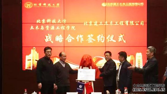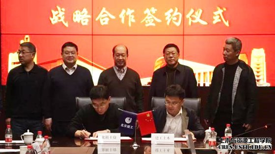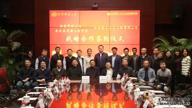 12月29日,土木与资源工程学院与北京建工土木工程有限公司签订战略合作框架协议在北京建工土木工程有限公司隆重举行。学院经理金龙哲,党委书记纪洪广带领全体院领导以及土木系教授代表参加会议。北京建工集团党委常委、土木公司董事邢迎秋,党委副书记、总经理杨志强与公司其他领导以及相关职能部门负责人一同参加了会见。