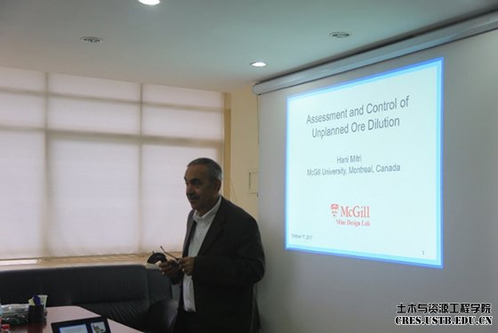 10月18日上午,Hani Mitri教授在土木楼1206室做了题为“Assessment and Control of Unplanned Ore Dilution in Metal Mines: Case Studies”的专题学术报告。
