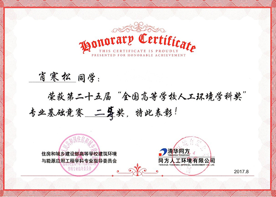 “人环奖”竞赛历史悠久,1992年由住房和城乡建设部高等学校建筑环境与能源应用工程学科专业指导委员会发起设立,同方人工环境有限公司提供资金赞助。25年来已成为我国建筑环境与能源应用工程专业历时最长、参赛规模和影响最大的学科竞赛,其考试成绩被视为全国高校建环专业基础教学质量的测评依据,也被多数高校作为员工评定奖学金和保研的重要依据。公司从2009年起参加此项赛事,在吴延鹏老师的指导下取得了6个二等奖,2个三等奖的优异成绩。