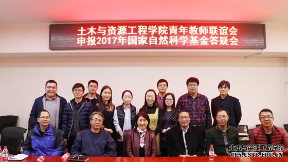 为鼓励青年教师积极申报国家自然科学基金,增进学术交流与合作,3月6日,土木与资源工程学院青年教师联谊会举行申报2017年国家自然科学基金集体答疑会。王媛、何学秋、宋卫东、朱维耀、孙春宝、王洪江等专家教授应邀出席答疑会