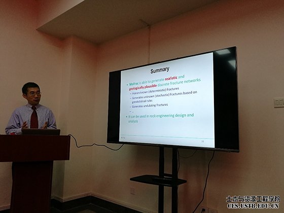 蔡明教授首先介绍了劳伦森大学及其所处的萨德伯里市的基本情况,随后从不同尺度下的岩体裂隙情况引入,对于断裂的形成机理进行说明,并提出了DFN (Discrete Fracture Network) 建模的应用。在此基础上,蔡教授介绍了其团队开发的用于生成裂隙网格系统的软件MoFrac,其独创性在于能够生成近似符合实际和地质层面上的离散裂隙网络,在岩石工程设计分析领域有着重要应用。报告结束后,老师和同学们纷纷提出了自己的疑惑和见解,现场气氛十分热烈。