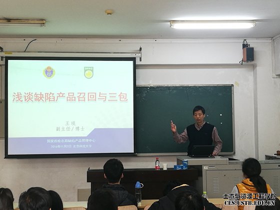 应公司安全科学与工程系书记黄国忠老师的邀请,国家质检总局缺陷产品管理中心主任王琰博士莅临公司,在土木楼302室做了题为“浅谈缺陷产品召回与三包”的学术讲座,黄国忠老师担任本次讲座的主持人,安全科学与工程系2016级研究生聆听了此次学术报告。