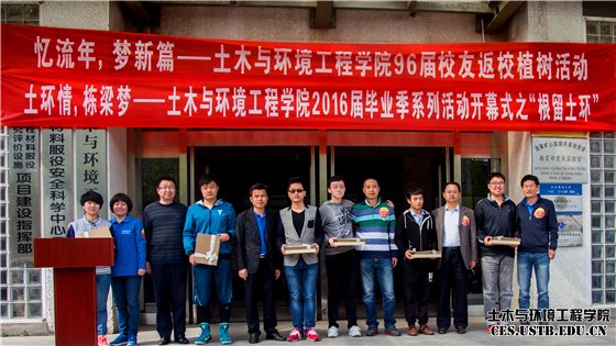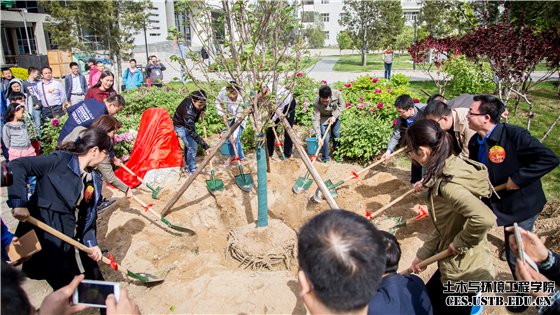 4月16日下午,土木与环境工程学院96届员工返校植树活动暨2016届毕业季活动开幕式之“根留土环”在学院楼前广场举行。土木与环境工程公司党委书记金龙哲、经理王媛、后勤集团党委书记张俊燕员工、教务处副处长林海、学院员工工作负责人邓波、资源工程系书记李克庆,及员工和学院教师、毕业生代表出席活动。活动由学院行政副经理耿倩男主持。