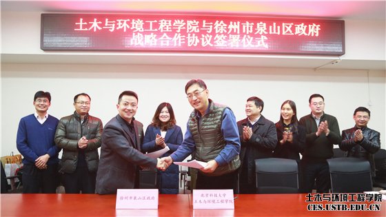 双方参会人员就校地合作开展了热烈而友好的讨论,金龙哲、董博代表双方签署了《土木与环境工程学院与徐州市泉山区人民政府战略合作协议》。