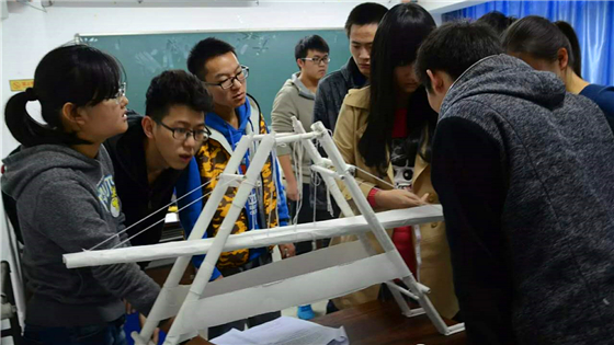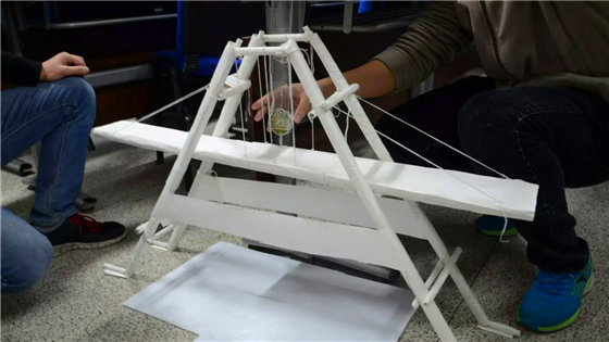 初赛评分包括模型构型尺寸、模型结构重量、静态加载等部分。经过前期赛事培训和参赛队伍的精心准备,每个模型的结构和设计,都令人叹为观止。晋级的“堑途队”以质轻安全为设计理念,运用结构力学和材料力学的分析方法,计算出危险点,对危险点进行加固处理,保证加载成功;又对既定方案进行单独加载测试,在安全加载的前提下适当减少用纸和胶量,将专业知识和动手实践进行了完美的结合。