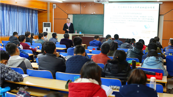11月6日晚,土木与环境工程学院2015年员工党支部书记培训报告会在金诚信报告厅举行,学院员工工作负责人邓波以《学习新文件领悟新精神-踏实做好员工党支部工作》为主题,为学院员工党支部书记及支委做了分享交流,学院员工党总支委员、全体辅导员一同聆听报告。