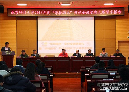 2014年度“华特磁电”奖学金颁奖典礼近日在图书馆报告厅隆重举行。山东华特磁电科技股份有限公司董事长兼总经理王兆连、常务副总经理刘风亮来到现场与同学们互动交流,土木与环境工程公司党委书记金龙哲、党委副书记陈大鹏、矿物加工工程系书记孙体昌等公司、学院领导及矿物加工专业师生100余人出席活动。