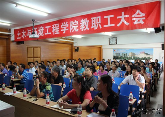 为总结2014上半年工作,更好地对下半年工作进行规划及指导,土木与环境工程学院于9月16日在土木楼402召开了本学期第一次的全体教职工大会。教务处副处长林海及学院100余名教职工参加,会议由学院行政副经理耿倩男主持。
