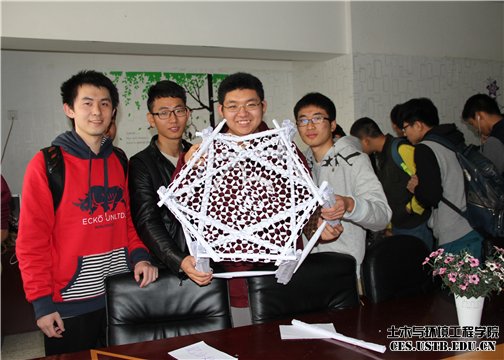 土木1401与1402联合学霸队格外引人注目,虽然是新生,但他们的作品以六边形的独特结构创意无限,纸环接连形成的精细奇妙的“弹簧棚面”更令人赞叹不绝,展现了新生丰富的想象力和创造力。