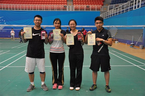 随后进行的是女单决赛和男单决赛,李小翠对阵彭荩娴,李小翠同学技胜一筹,分别以21:12和21:15的比分连胜两局,赢得最终的女单冠军。男单方面,万思达对阵朱敏杰,万思达以21:17和21:18的比分连续拿下两局,获得最终的男单冠军。