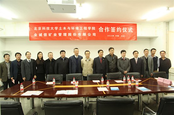 仪式上,与王先成签订共建矿业开发实验室合作项目协议书和奖助学金协议,吕朝伟向金诚信公司颁发了捐资证书。