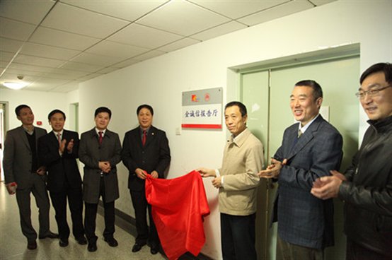 最后,王先成与张文明一同为为金诚信报告厅揭牌,并合影留念。