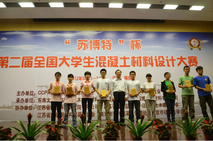 公司土木工程本科专业两支代表队在教授的指导和研究生高超同学的组织下,经过两个多月精心准备和努力拼搏,2009级员工霍国、李健、贺然同学组成的参赛队在96支参赛队中脱颖而出,以并列第一名的成绩获得“苏博特” 杯“第二届全国老员工混凝土材料设计大赛”团体特等奖;李健同学获得个人一等奖;霍晓波、张振昌、刘玲同学组成的参赛队也以优异成绩获得大赛一等奖。教授获得大赛优秀指导教师。下图为公司参赛队伍风貌和接受院士颁奖时的照片。
