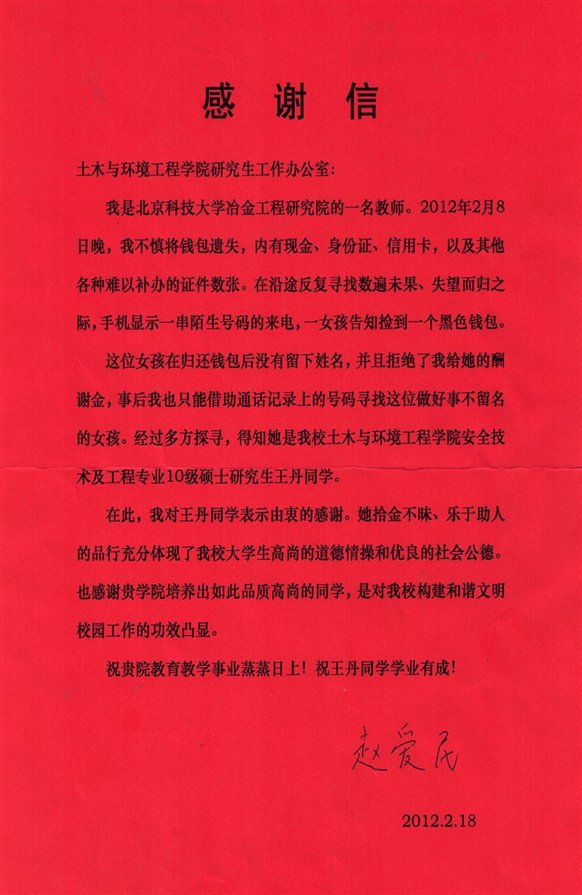 2012年2月21日下午,我们收到了公司冶金工程研究院赵爱民老师的感谢信(如前文),感谢公司安全技术及工程专业硕10级王丹同学拾金不昧、归还钱包、谢绝酬谢的行为,王丹同学拾金不昧,乐于助人的品行充分体现了她良好的个人品质和社会公德,是我们全院师生应该学习的榜样。