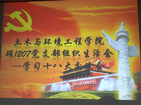 2012年11月27日晚8时,土木与环境学院环流硕1207党支部在土环楼402室举行以“学习交流十八大精神”为主题的组织生活会,全体党员同志集聚一堂热烈讨论并积极发表对党的十八大精神的认识,同时就自己关心问题发表自己的看法。