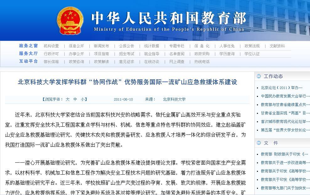 在金平果2011-2012年中国大学本科教育分专业竞争力排行榜上,公司安全工程排名全国第一。从该排行榜近三年的排名情况看,公司安全工程的排名逐年提高,2009年排名第5,2010年排名第2,今年排名第1。此次排名说明公司安全工程本科教育在近几年取得了长足的进步,安全07级52名毕业员工中,有10名员工出国深造,一名保送中科院,1名保送浙江大学,上研率60%,就业率96.15%;安全08级目前已有2名同学保送清华大学,成绩突出。教育部网站上报道了该专业采取多项举措,发挥学科群“协同作战”优势服务国际一流矿山应急救援体系建设的近况(网址:),同时学科点建设了国家级特色专业网站(网址:safets.ustb.edu.cn),对专业建设进行了跟踪报道。