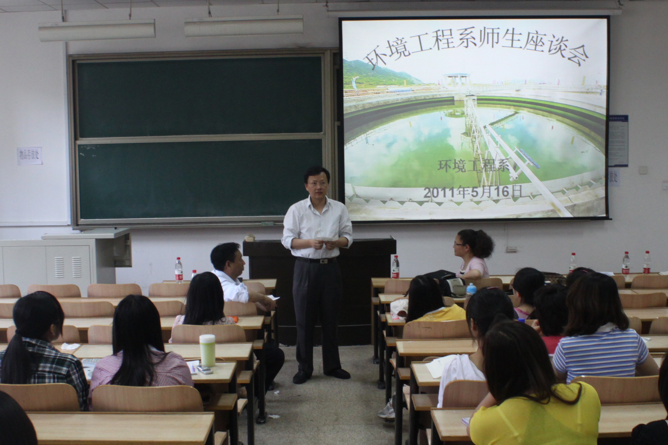 2011年5月16日周一下午2:50,环境工程专业本科07、08级同学在逸夫楼102和本专业的老师们召开了一次师生交流会。参加交流会的环境专业老师有:土木与环境工程学院副经理教授,主任教授,教授、教授、教授、副教授,以及环境0802班主任老师。