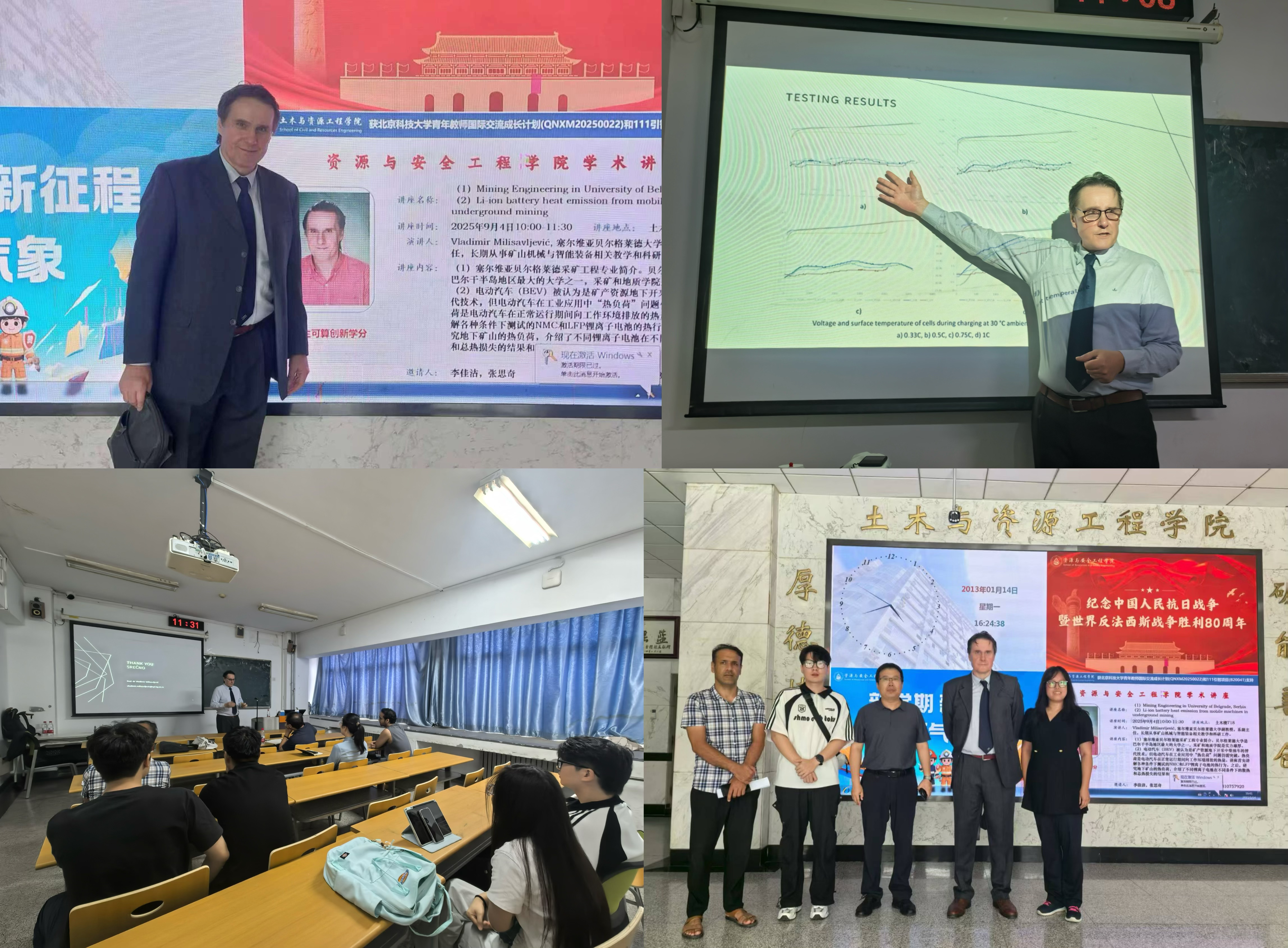 2025年9月4日,Milisavljević教授在校本部718教室进行了《贝尔格莱德大学矿业工程学科》和《地下矿山装备用锂离子电池放热性能研究》的学术报告。能源与环境工程学院教授马鸿志,李佳洁、学院安全科学与工程系讲师王雪博士以及研究生、本科生参加了此次报告。报告过程Milisavljević教授现场气氛活跃,学术氛围浓厚。
