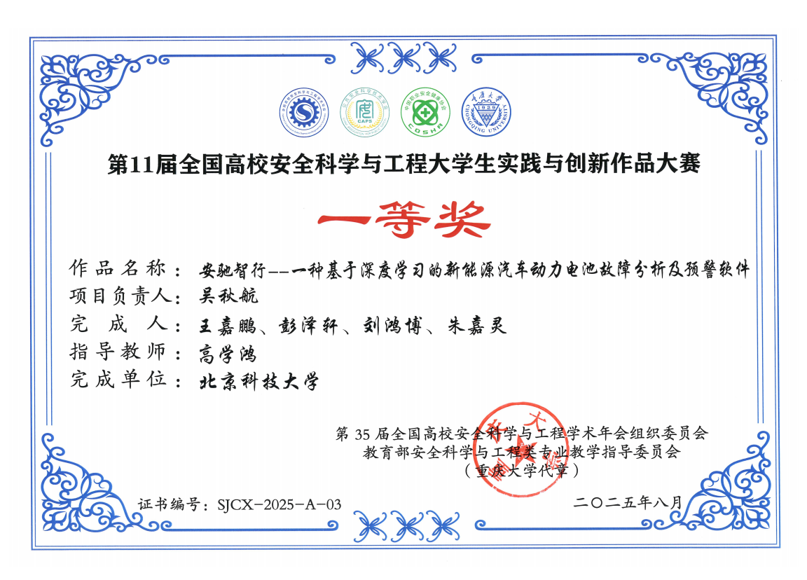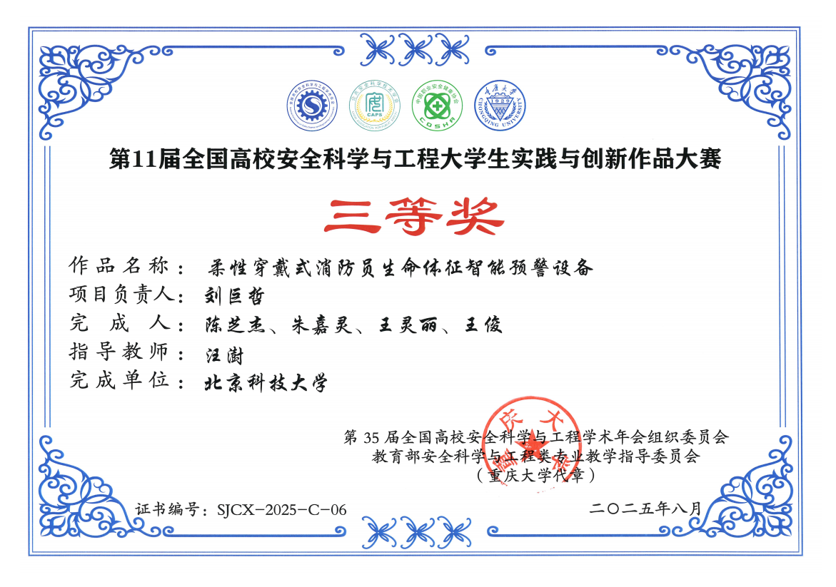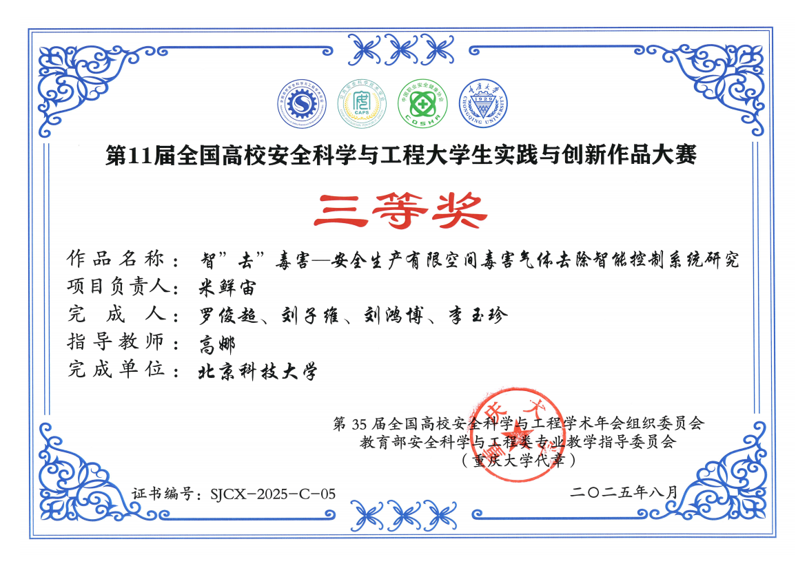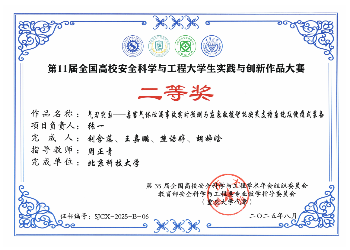 所获奖项:第11届全国高校安全科学与工程老员工实践与创新作品大赛国家级二等奖