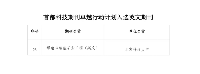 近日,北京市科学技术协会发布了《关于2025年度首都科技期刊卓越行动计划中英文单刊拟入选名单的公示》通知,经公开申报、形式审查、定量计分、专家评审和公示,《绿色与智能矿业工程(英文)》成功入选2025年度首都科技期刊卓越行动计划“重点英文期刊”。