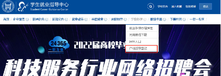 1.进入北科老员工就业指导中心(job.ustb.edu.cn),点击手续办理,选择下拉菜单“户口迁移登记”。
