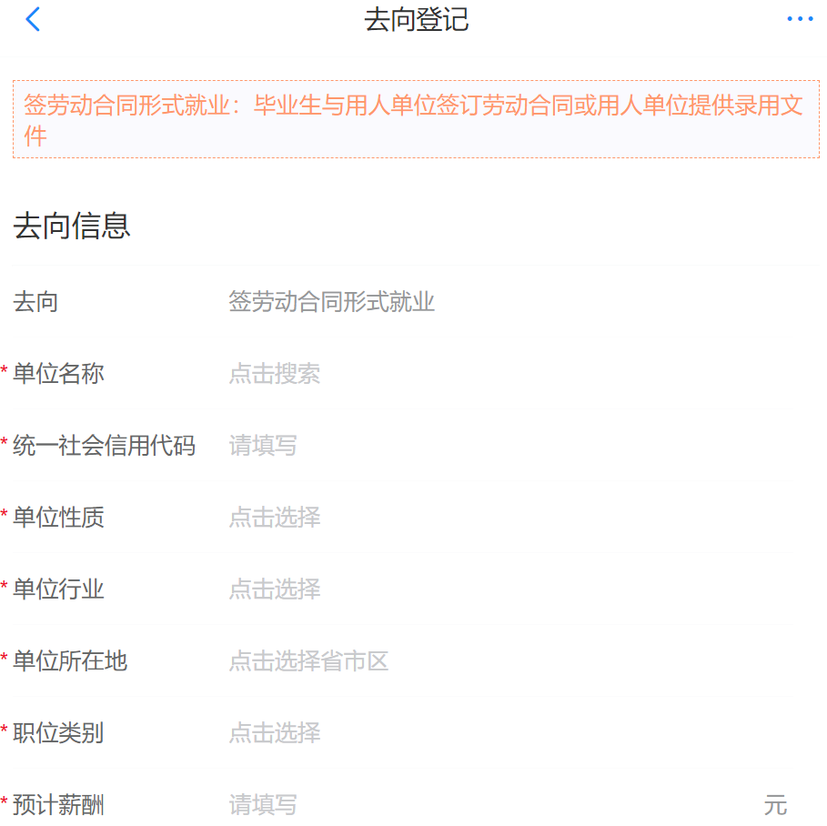 6.点击“无需就业协议 去向登记”,选择“签劳动合同形式就业”。